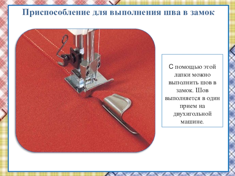 Приспособление для выполнения шва в замокС помощью этой лапки можно выполнить шов в замок. Шов выполняется в