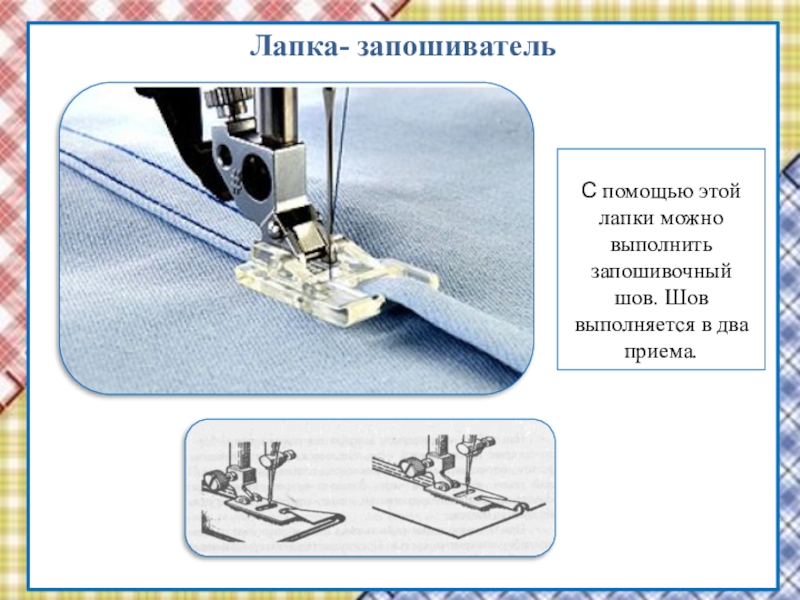 Лапка- запошивательС помощью этой лапки можно выполнить запошивочный шов. Шов выполняется в два приема.