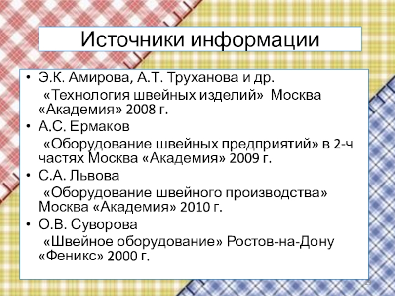 Источники информацииЭ.К. Амирова, А.Т. Труханова и др.	«Технология швейных изделий» Москва «Академия» 2008 г.А.С. Ермаков	«Оборудование швейных предприятий» в