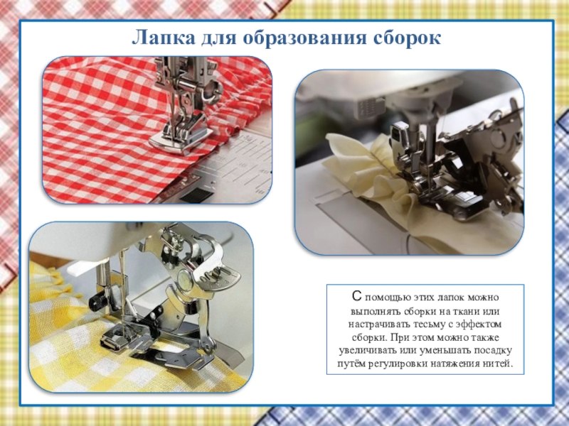 Лапка для образования сборокС помощью этих лапок можно выполнять сборки на ткани или настрачивать тесьму с эффектом