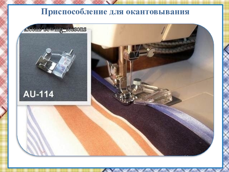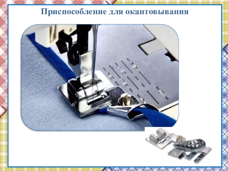 Приспособление для окантовывания  Артикул 795-844-032 Для обработки краёв эластичных тканей. Приспособление подворачивает полоску ткани вокруг необработанного