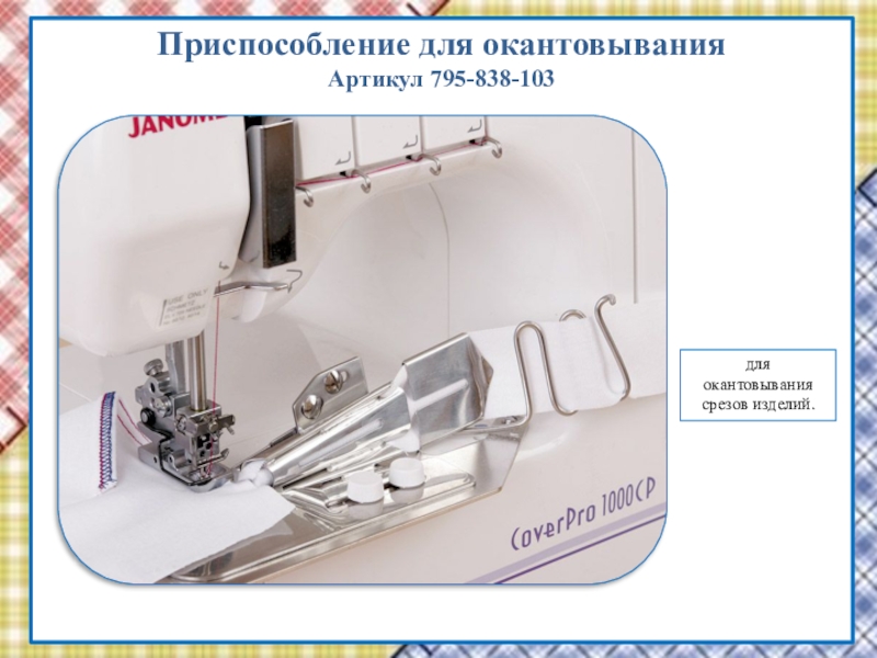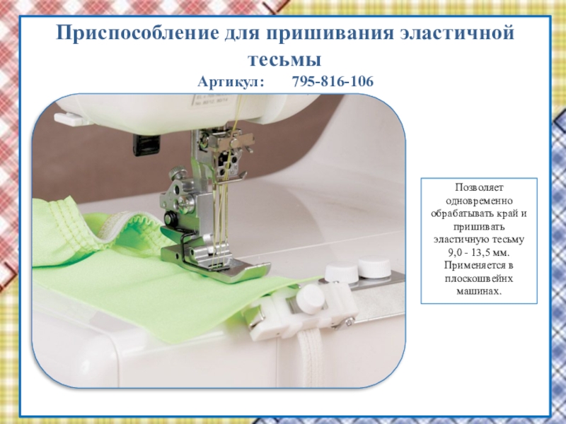 Слайд 14Приспособление для пришивания эластичной тесьмы Артикул: 795-816-106