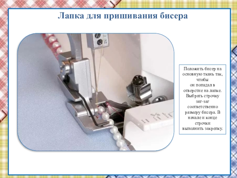 Лапка для пришивания бисераПоложить бисер на основную ткань так, чтобы он попадал в отверстие на