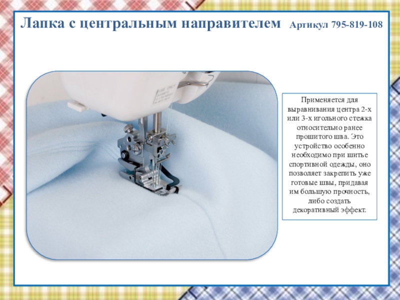 Лапка с центральным направителем Артикул 795-819-108 Применяется для выравнивания центра 2-х или 3-х игольного стежка относительно ранее