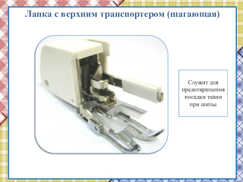 Лапка с верхним транспортером (шагающая)Служит для предотвращения посадки ткани при шитье