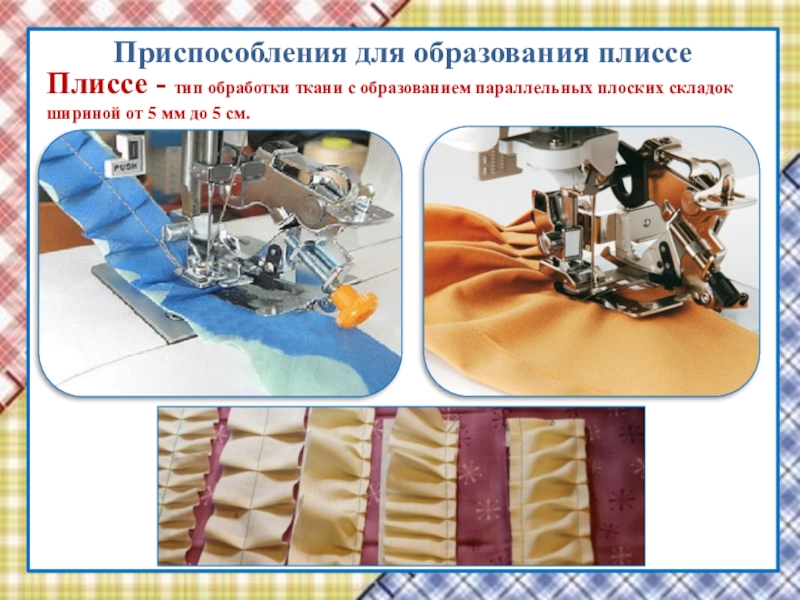 Приспособления для образования плиссеПлиссе - тип обработки ткани с образованием параллельных плоских складок шириной от 5 мм
