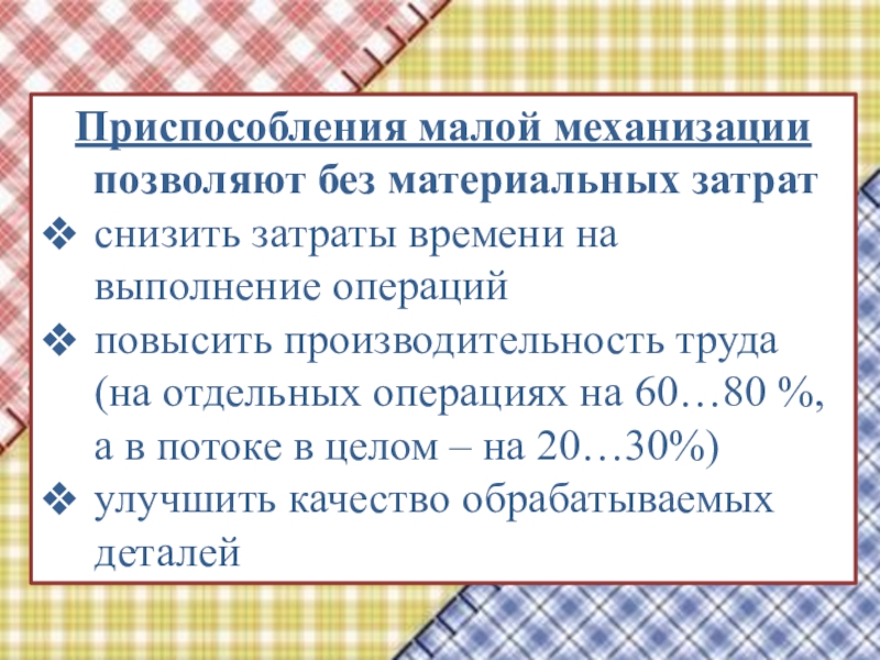 Слайд 2Приспособления малой механизации позволяют без материальных затрат