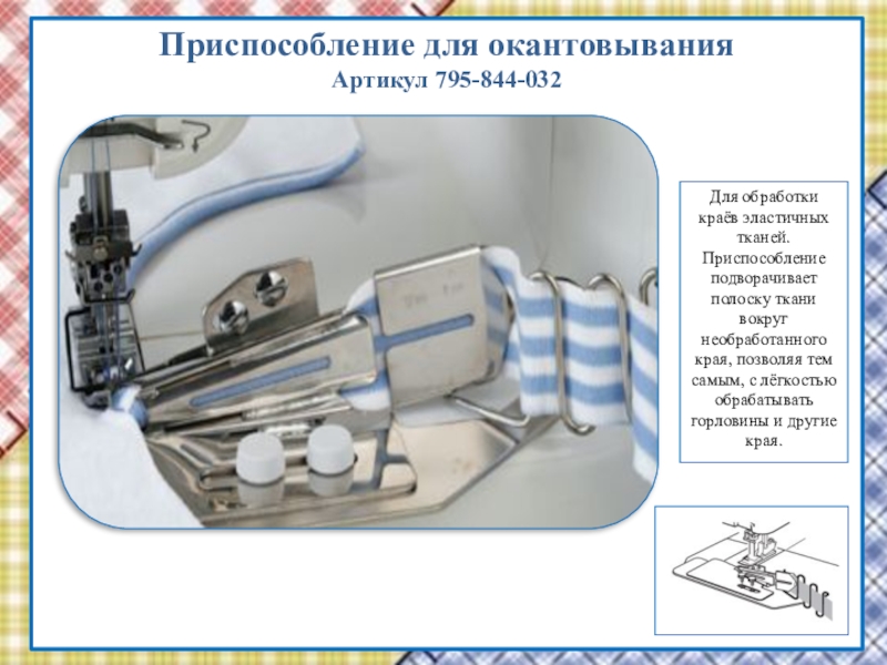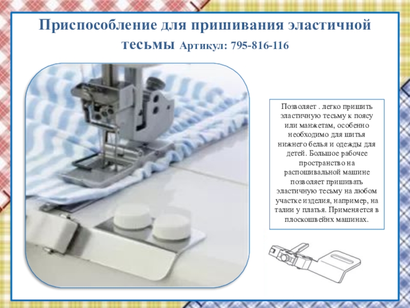 Слайд 13Приспособление для пришивания эластичной тесьмы Артикул: 795-816-116