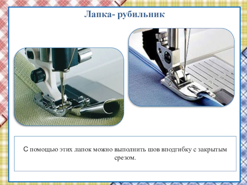 Лапка- рубильникС помощью этих лапок можно выполнить шов вподгибку с закрытым срезом.