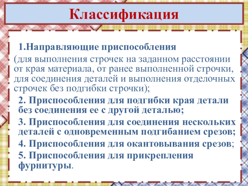 Классификация 1.Направляющие приспособления (для выполнения строчек на заданном расстоянии от края материала, от ранее выполненной строчки, для