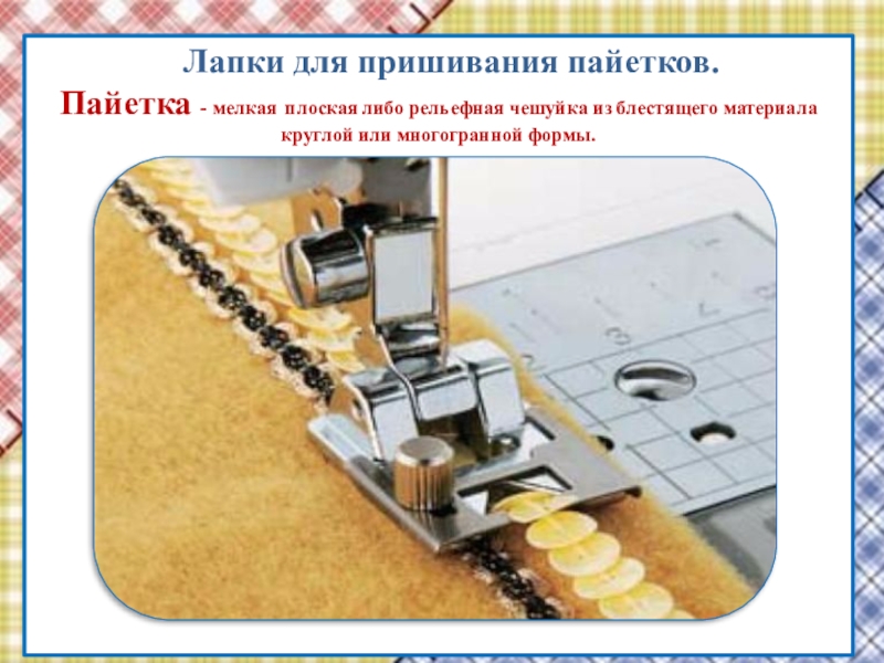 Слайд 27 Лапки для пришивания пайетков. Пайетка - мелкая плоская либо