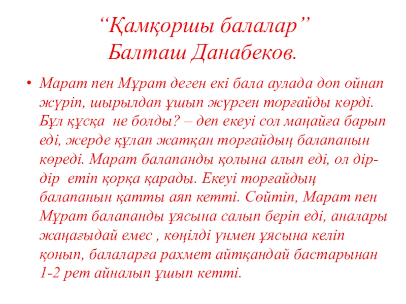 “Қамқоршы балалар” Балташ Данабеков.Марат пен Мұрат деген екі бала аулада доп ойнап жүріп, шырылдап ұшып жүрген торғайды
