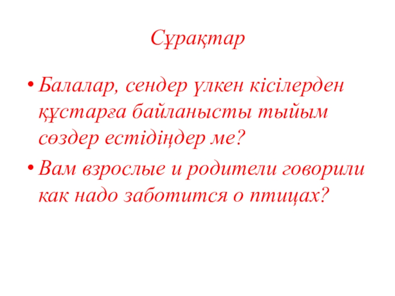 СұрақтарБалалар, сендер үлкен кісілерден құстарға байланысты тыйым сөздер естідіңдер ме? Вам взрослые и родители говорили как надо