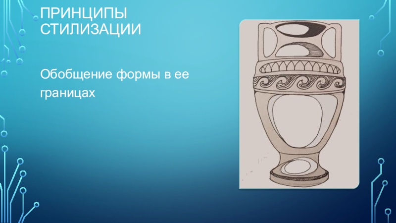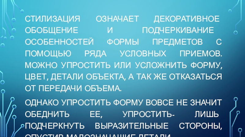 Слайд 9Стилизация означает декоративное обобщение и подчеркивание особенностей формы предметов с помощью