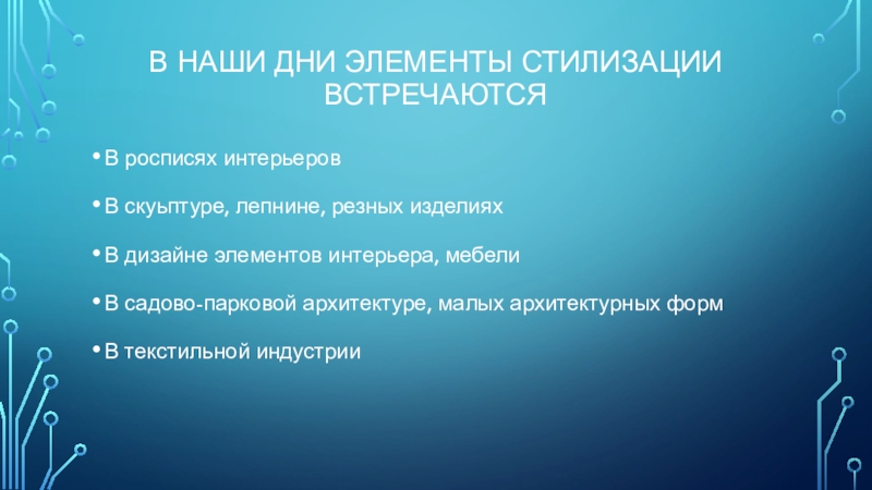 В наши дни элементы стилизации встречаются  В росписях интерьеров В скуьптуре, лепнине, резных изделияхВ дизайне элементов