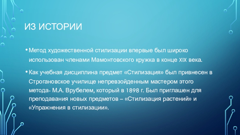 Как учебная дисциплина предмет «Стилизация» был привнесен в Строгановское училище непревзойденным мастером этого метода- М.А. Врубелем, который в 1898 г. Был приглашен для преподавания новых предметов – «Стилизация растений» и «Упражнения в стилизации».