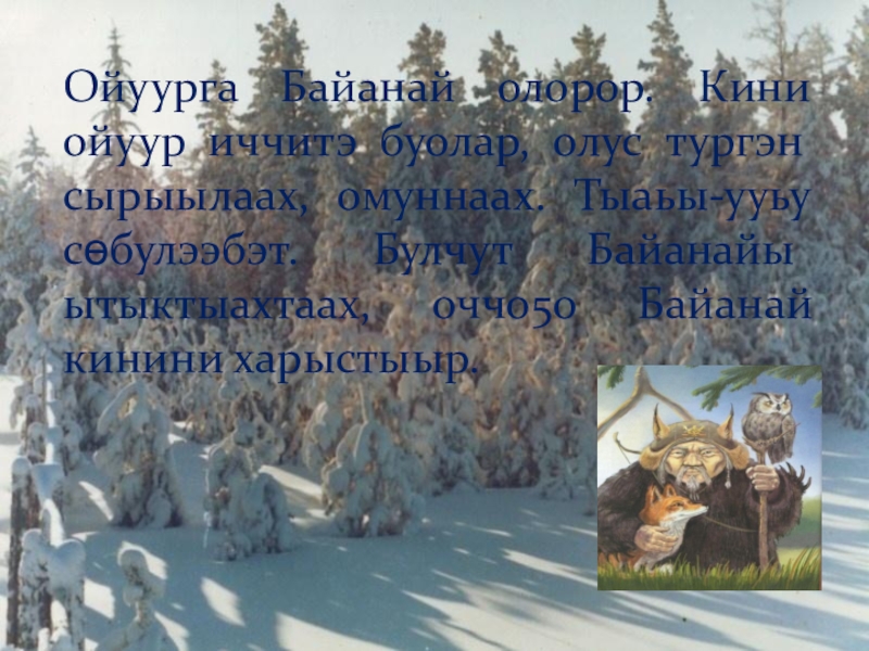 Слайд 3 Ойуурга Байанай олорор. Кини ойуур иччитэ буолар, олус тургэн сырыылаах, омуннаах.