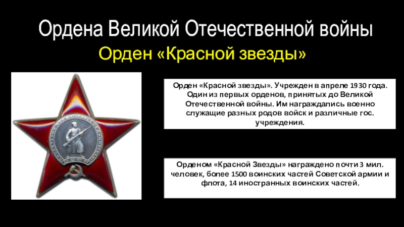 Орденом «Красной Звезды» награждено почти 3 мил. человек, более 1500 воинских частей Советской армии и флота, 14 иностранных воинских частей.