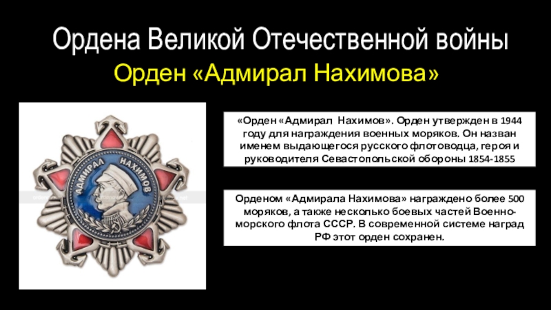 Орденом «Адмирала Нахимова» награждено более 500 моряков, а также несколько боевых частей Военно-морского флота СССР. В современной системе наград РФ этот орден сохранен.