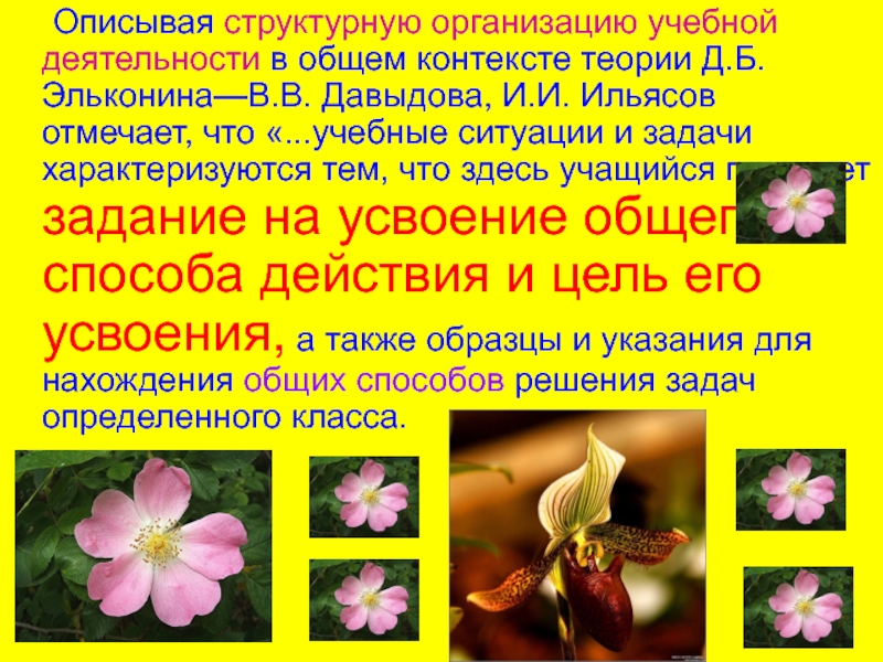 Давыдова, И.И. Ильясов отмечает, что «...учебные ситуации и задачи характеризуются тем, что здесь учащийся получает задание на усвоение общего способа действия и цель его усвоения, а также образцы и указания для нахождения общих способов решения задач определенного класса.