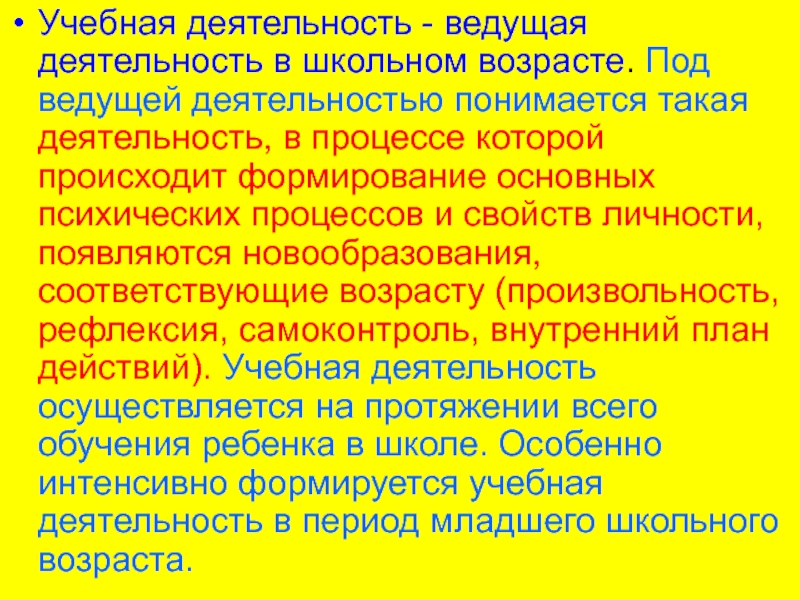 понимается такая деятельность, в процессе которой происходит формирование основных психических процессов и свойств личности, появляются новообразования, соответствующие возрасту (произвольность, рефлексия, самоконтроль, внутренний план действий). Учебная деятельность осуществляется на протяжении всего обучения ребенка в школе. Особенно интенсивно формируется учебная деятельность в период младшего школьного возраста.