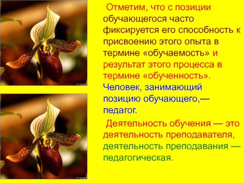 этого опыта в термине «обучаемость» и результат этого процесса в термине «обученность». Человек, занимающий позицию обучающего,— педагог.