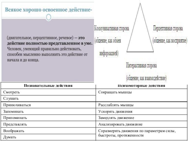 действий: слушать и понимать... читать и писать, считать, складывать и вычитать, производить грамматический, математический, исторический анализ и т. д. - все это разные действия: умственные, перцептивные, речевые, физические.