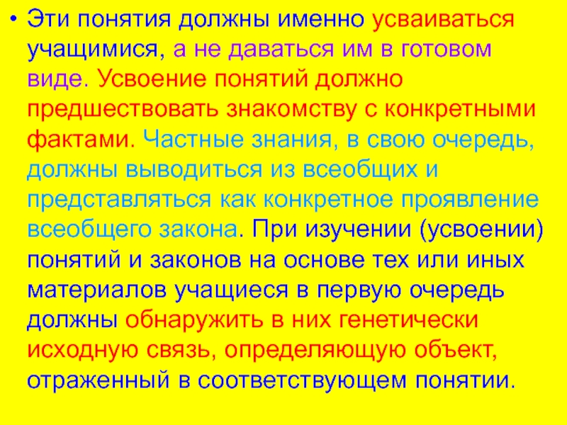 готовом виде. Усвоение понятий должно предшествовать знакомству с конкретными фактами. Частные знания, в свою очередь, должны выводиться из всеобщих и представляться как конкретное проявление всеобщего закона. При изучении (усвоении) понятий и законов на основе тех или иных материалов учащиеся в первую очередь должны обнаружить в них генетически исходную связь, определяющую объект, отраженный в соответствующем понятии.