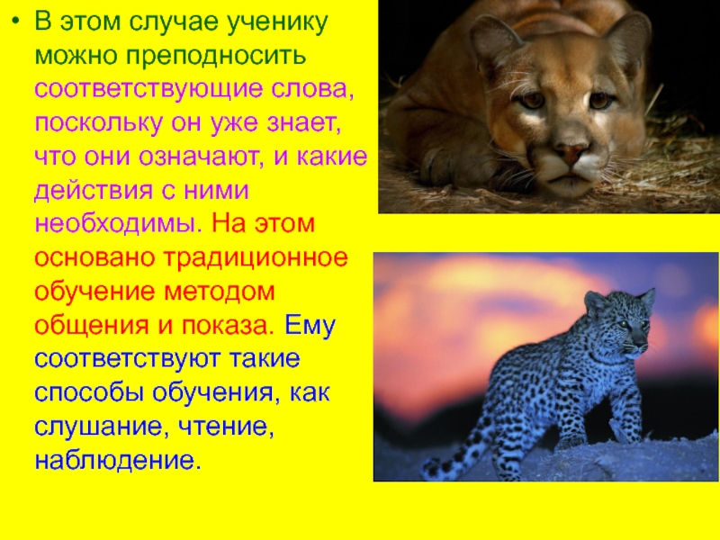 знает, что они означают, и какие действия с ними необходимы. На этом основано традиционное обучение методом общения и показа. Ему соответствуют такие способы обучения, как слушание, чтение, наблюдение.
