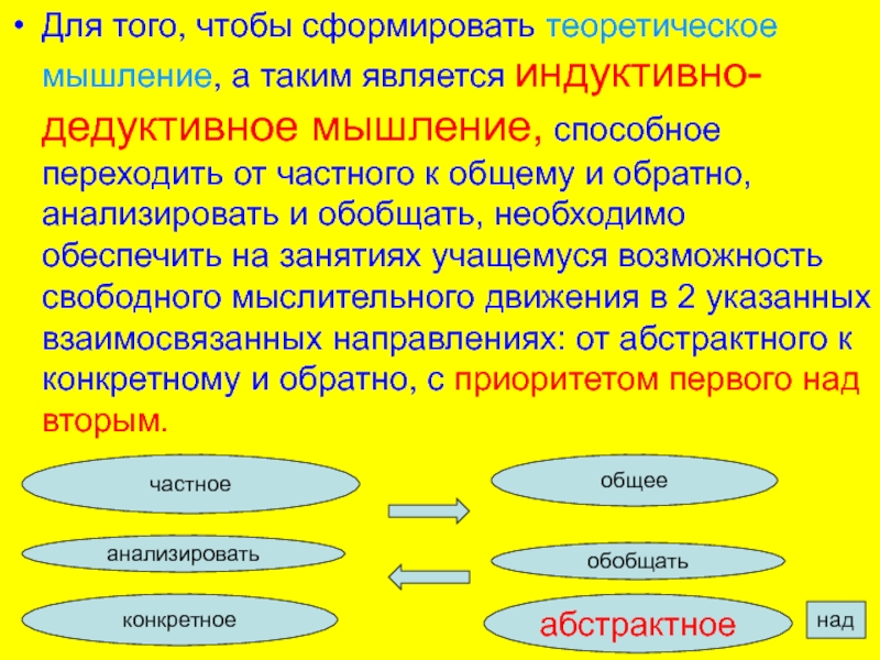 способное переходить от частного к общему и обратно, анализировать и обобщать, необходимо обеспечить на занятиях учащемуся возможность свободного мыслительного движения в 2 указанных взаимосвязанных направлениях: от абстрактного к конкретному и обратно, с приоритетом первого над вторым.
