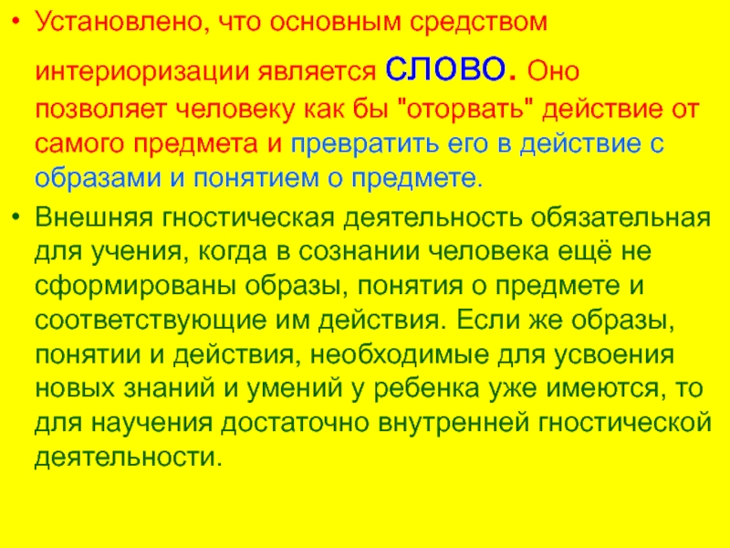 Слайд 48Установлено, что основным средством интериоризации является слово. Оно позволяет человеку как