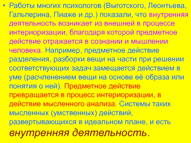 внутренняя деятельность возникает из внешней в процессе интериоризации, благодаря которой предметное действие отражается в сознании и мышлении человека. Например, предметное действие разделения, разборки вещи на части при решении соответствующих задач замещается действием в уме (расчленением вещи на основе её образа или понятия о ней). Предметное действие превращается в процесс интериоризации, в действие мысленного анализа. Системы таких мысленных (умственных) действий, развертывающихся в идеальном плане, и есть внутренняя деятельность.