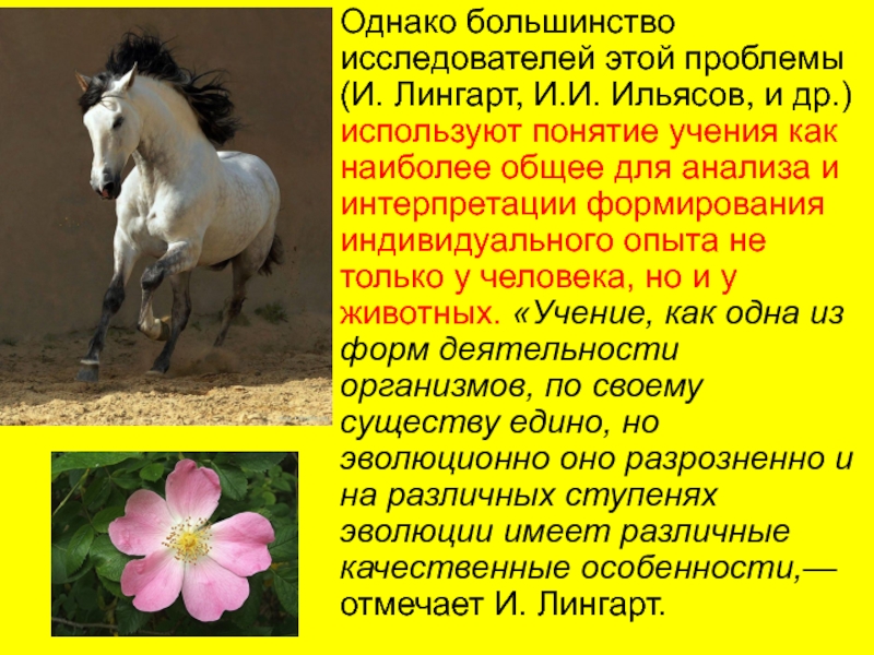 используют понятие учения как наиболее общее для анализа и интерпретации формирования индивидуального опыта не только у человека, но и у животных. «Учение, как одна из форм деятельности организмов, по своему существу едино, но эволюционно оно разрозненно и на различных ступенях эволюции имеет различные качественные особенности,— отмечает И. Лингарт.