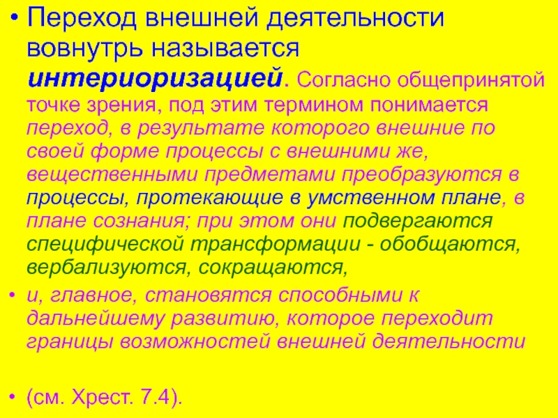 Слайд 41Переход внешней деятельности вовнутрь называется интериоризацией. Согласно общепринятой точке зрения, под