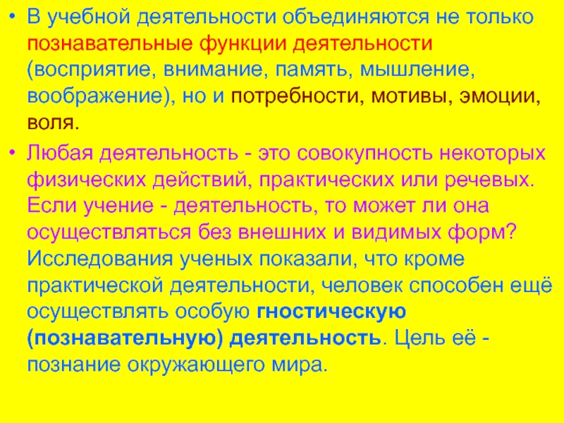 Слайд 46В учебной деятельности объединяются не только познавательные функции деятельности (восприятие, внимание,