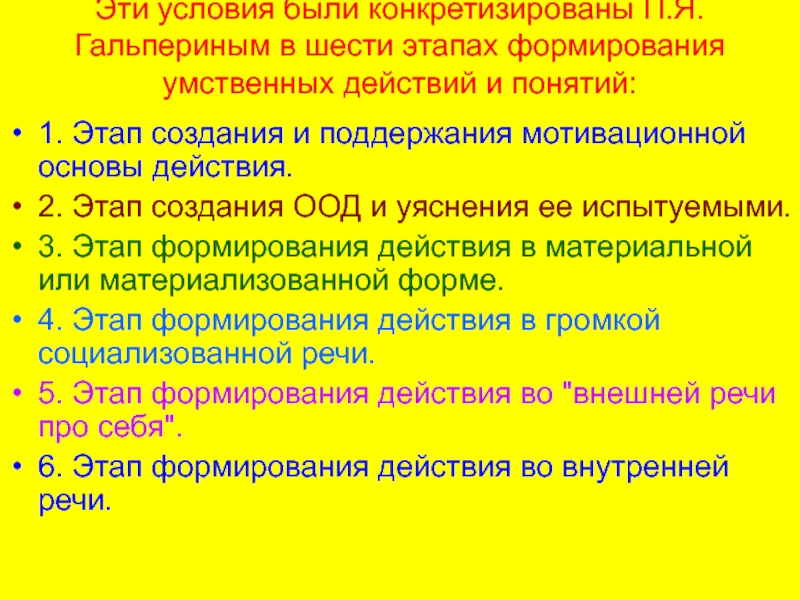 Слайд 43Эти условия были конкретизированы П.Я. Гальпериным в шести этапах формирования умственных