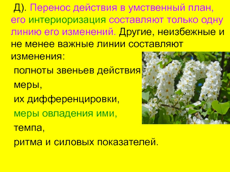 Слайд 34 Д). Перенос действия в умственный план, его интериоризация составляют только одну