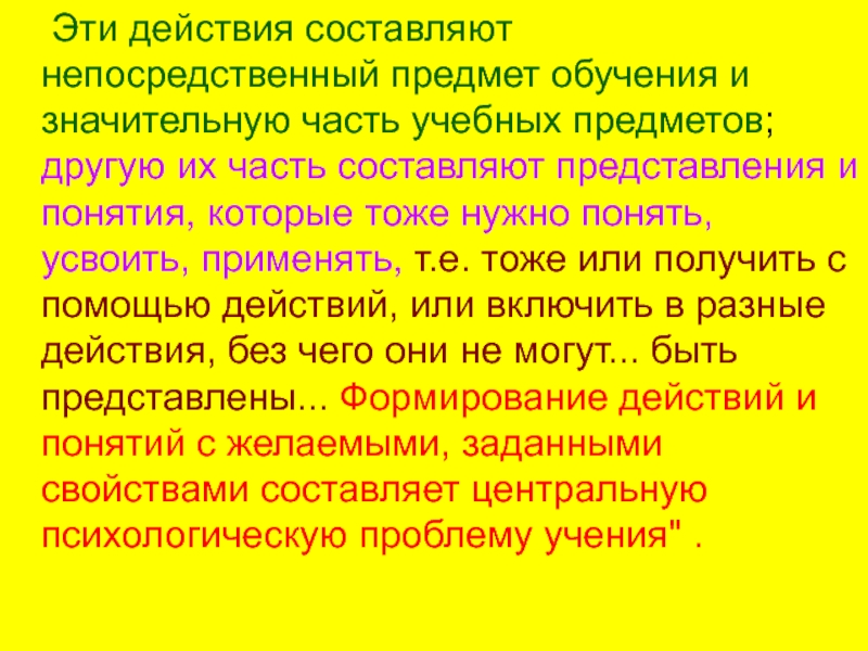 другую их часть составляют представления и понятия, которые тоже нужно понять, усвоить, применять, т.е. тоже или получить с помощью действий, или включить в разные действия, без чего они не могут... быть представлены... Формирование действий и понятий с желаемыми, заданными свойствами составляет центральную психологическую проблему учения" .