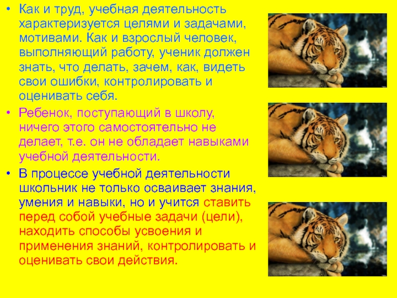Слайд 54Как и труд, учебная деятельность характеризуется целями и задачами, мотивами. Как