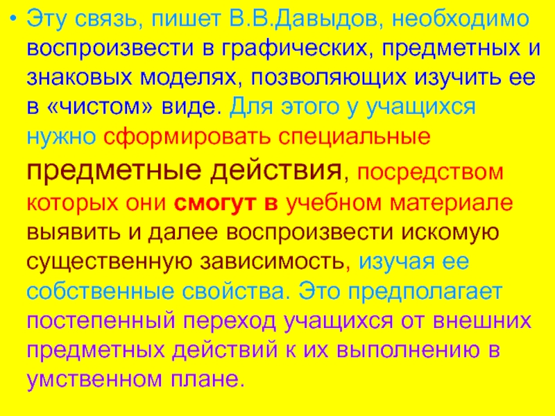 Слайд 10Эту связь, пишет В.В.Давыдов, необходимо воспроизвести в графических, предметных и знаковых