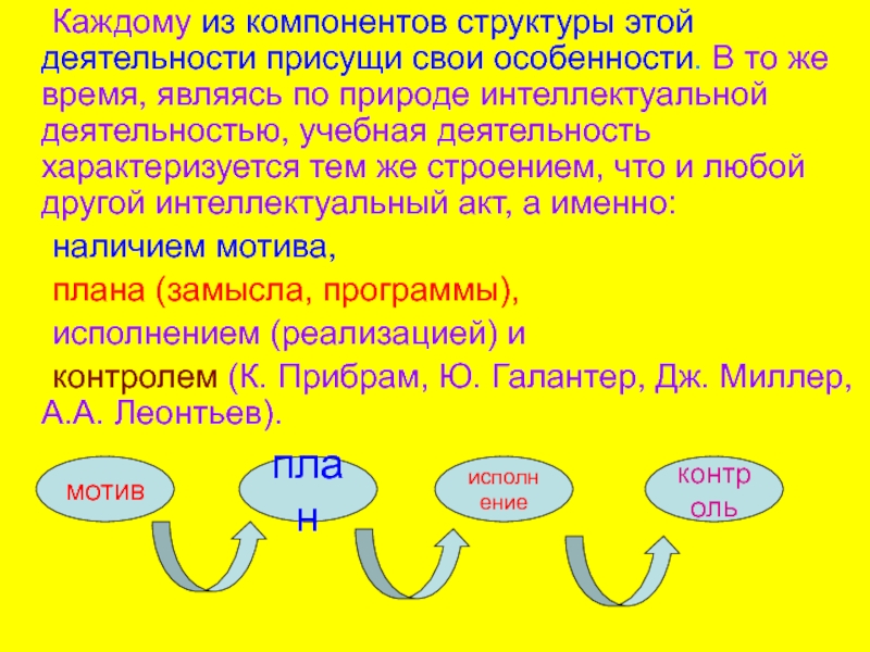 Слайд 12 Каждому из компонентов структуры этой деятельности присущи свои особенности. В то