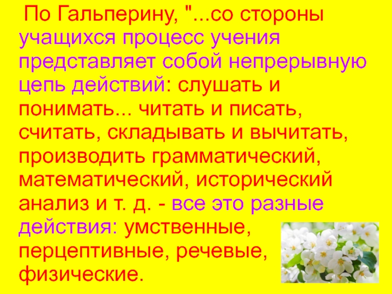 Слайд 38 По Гальперину, "...со стороны учащихся процесс учения представляет собой непрерывную цепь