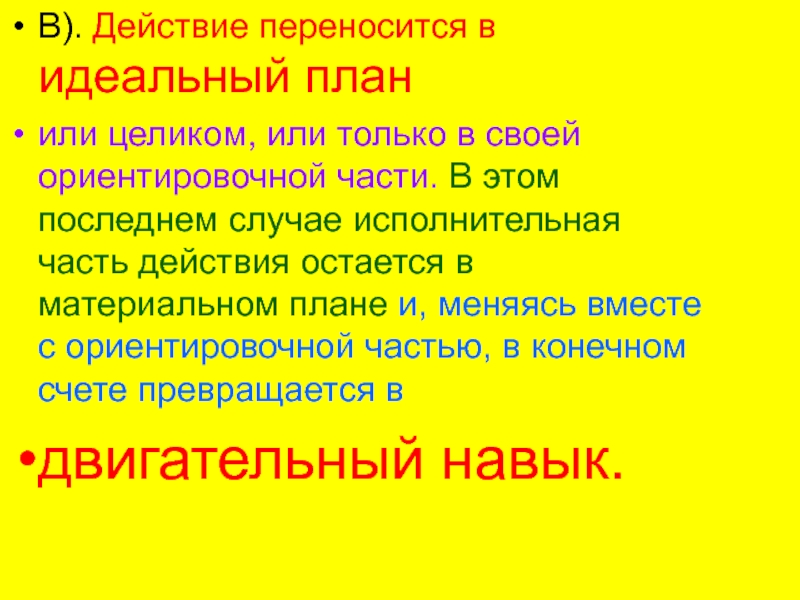 своей ориентировочной части. В этом последнем случае исполнительная часть действия остается в материальном плане и, меняясь вместе с ориентировочной частью, в конечном счете превращается в