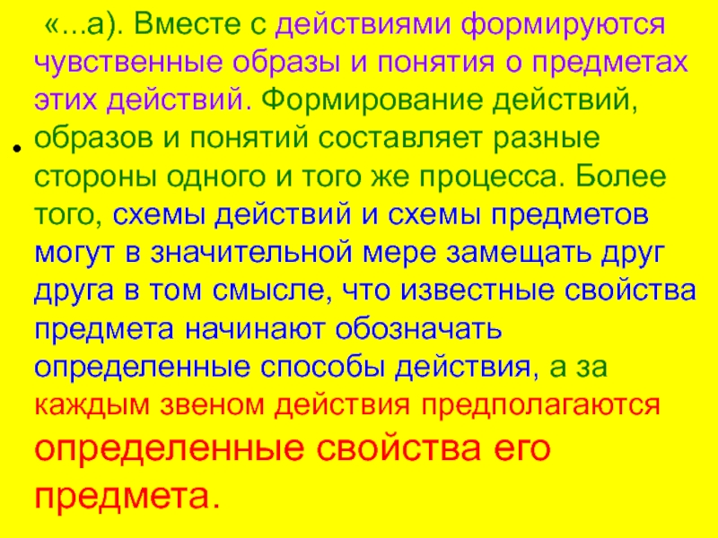 этих действий. Формирование действий, образов и понятий составляет разные стороны одного и того же процесса. Более того, схемы действий и схемы предметов могут в значительной мере замещать друг друга в том смысле, что известные свойства предмета начинают обозначать определенные способы действия, а за каждым звеном действия предполагаются определенные свойства его предмета.