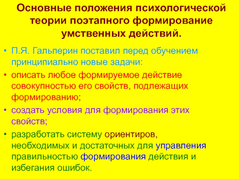 Слайд 27Основные положения психологической теории поэтапного формирование умственных действий.