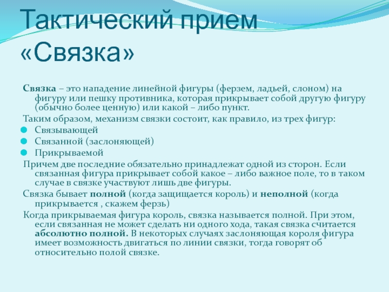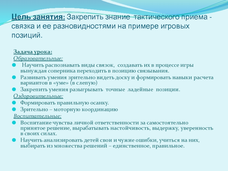 Научить распознавать виды связок, создавать их в процессе игры вынуждая соперника переходить в позицию связывания.