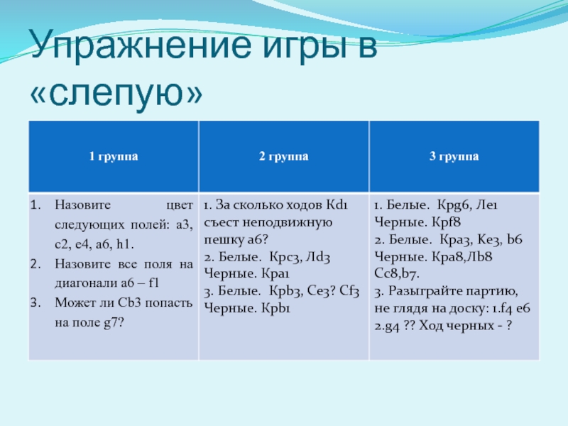 Развивать умения зрительно видеть доску и формировать навыки расчета вариантов в «уме» (в слепую)