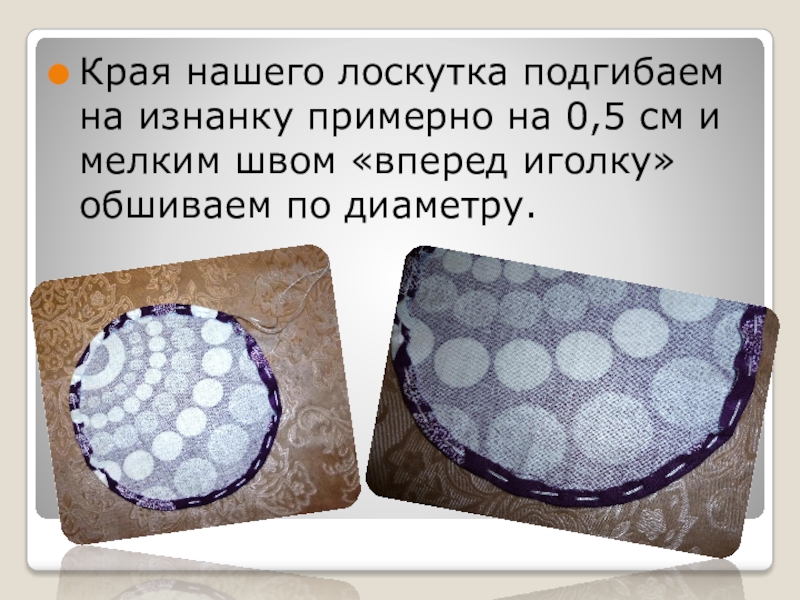 Слайд 4Края нашего лоскутка подгибаем на изнанку примерно на 0,5 см и