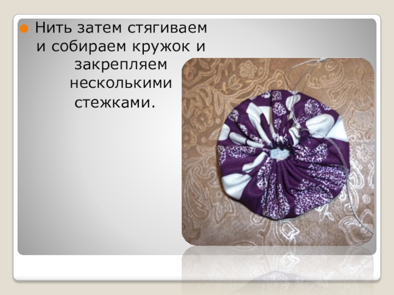 Слайд 5Нить затем стягиваем и собираем кружок и закрепляем несколькими