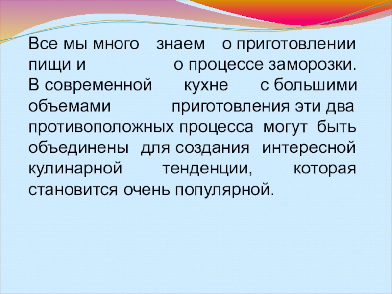 Слайд 2Все мы много знаем о приготовлении пищи и о процессе заморозки. В современной кухне с большими объемами приготовления эти два противоположных процесса